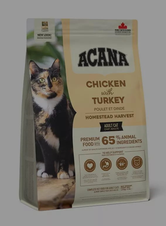 Udělejte radost vaší kočce touto skvělou recepturou plnou živočišných surovin. NOVINKA ACANA Homestead Harvest je nabitá kvalitními ingrediencemi včetně volně chovaného kuřete, krůty a kachny v bohatě vyživujícím poměru celé kořisti (maso, orgány, chrupavky a kosti). Tak získává vaše kočka přirozeně potřebné živiny, které ji udržují šťastnou, zdravou a silnou.