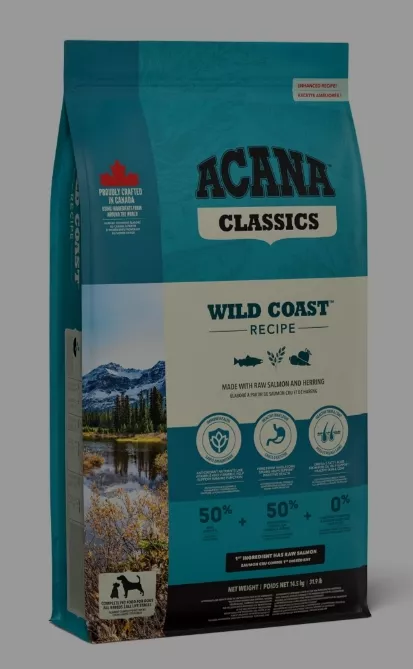 Receptury ACANA® jsou vytvořeny od začátku až do konce s použitím lahodných a kvalitních surovin. Acana Wild coast poskytuje vysoce kvalitní bílkoviny živočišného původu, které jsou pro psy nejlépe vstřebatelné. Pečlivě vybrané maso z ryb doplněné o výživné ovoce, obiloviny a zeleninu tvoří pestrou a vyváženou kombinaci, která vašemu pejskovi zajistí chutnou a sytou stravu. Toto krmivo pro psy s lososem se vyznačuje vysokým obsahem Omega-3 mastných kyselin z rybího tuku, které přispívají ke zdravé kůži a lesklé srsti, podporují silný zrak a jsou nezbytné pro správnou funkci oběhového a nervového systému. Antioxidanty z ovoce a zeleniny spolu s vitamínem C posilují imunitní systém, zatímco prebiotika a vláknina podporují zdravé trávení.
