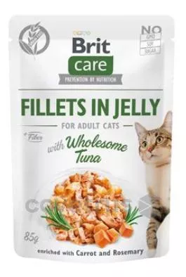 Brit Care Cat filetky v želé s výběrovým kuřecím a tuňákem. Obohaceno o mrkev a rozmarýn. Kompletní superprémiové mokré krmivo pro dospělé kočky.