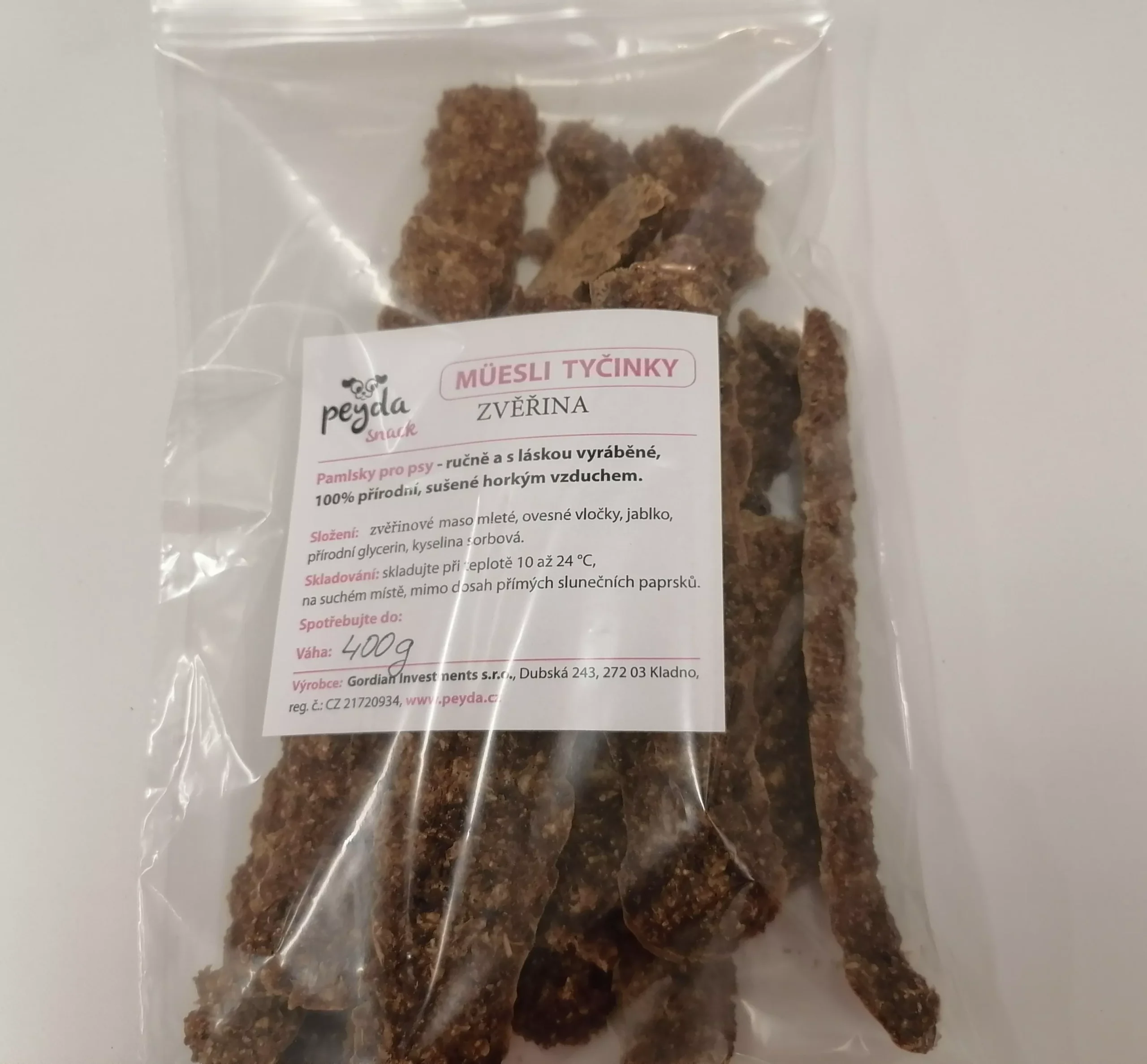 Složení: zvěřinové maso mleté, ovesné vločky, jablko, přírodní glycerin, kyselina sorbová. Skladování: Skladujte při teplotě 10 až 24 °C, na suchém místě, mimo dosah přímých slunečních paprsků. Spotřebujte do 3 měsíců – datum vyznačeno na obalu. Výrobce: Gordian Investments s.r.o.,Karlovarská 26, 273 51 Pavlov, reg. č.:CZ21717693, www.peyda.cz