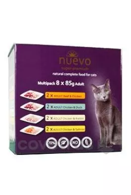 Nuevo kočka adult kuře a losos kapsička je kompletní krmivo pro dospělé kočky všech plemen, obohacené o kuřecí a lososí maso. Toto krmivo se může pyšnit svojí kvalitou, kterou reprezentuje vysoký obsah masa a přírodních suroviny, naopak neobsahuje žádné umělé přísady, obilí a lepek. Složení: 72% masa (42% kuřecího, 30% lososího), 26,5% vývar, 1%minerálních látek, 0,5% lososového oleje.