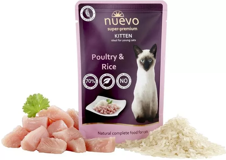 Kapsička Nuevo s drůbežím masem a s rýží – kompletní krmivo pro koťata. Dodává ty správné výživné látky podporující růst koťat. Vysoce kvalitní kuřecí a drůbeží maso (67%) je bohaté na dobré bílkoviny a ve spojení s rýží, která je výborně stravitelná, představuje dokonalý výchozí bod pro vaše kotě. Jedná se o vyváženou komplexní výživu se správnou úrovní bílkovin, tuků, minerálů a vitamínů podporujících zdravý růst. Složení podporuje imunitu a pohyblivost. Neobsahuje sóju ani žádná chemická aditiva. Vyrobeno v Německu.