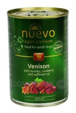 Krmivo podporuje zdravý kožich a podněcuje dobré trávení. Konzerva Nuevo Zvěřinové menu je vhodná pro dospělé psy všech plemen, s obsahem zvěřiny, celozrnými nudlemi a brusinkami. Vysoký obsah masa společně s nudlemi a vynikajícím světlicovým olejem jsou tím nejlepším z této receptury. Světlicový olej podporuje zdravý kožich díky dokonalé kombinaci esenciálních mastných kyselin a podněcuje dobré trávení.