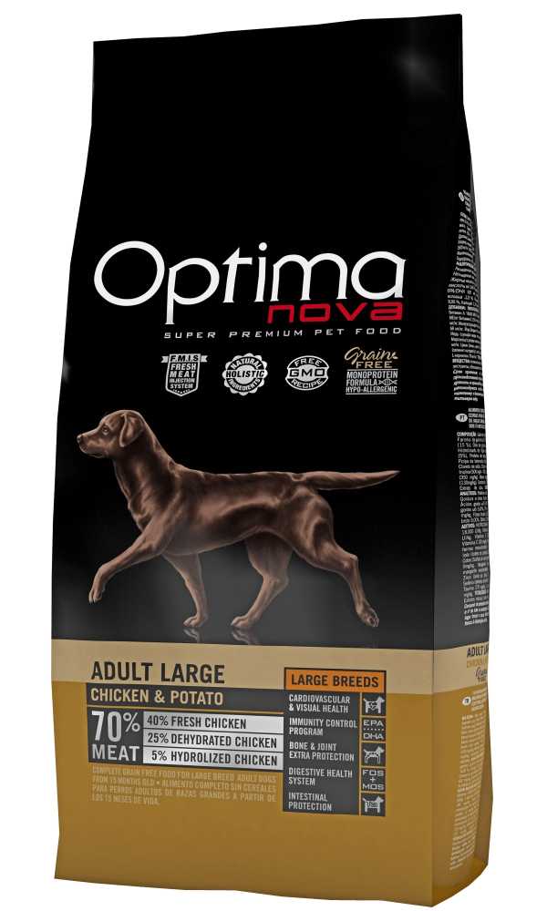 OPTIMAnova Dog Adult Large Chicken & Potato GF složené z kvalitních bílkovin a lehce stravitelných sacharidů v kombinaci s prospěšnými tuky . Krmivo obohacené o vitamíny, minerální látky a antioxidanty.