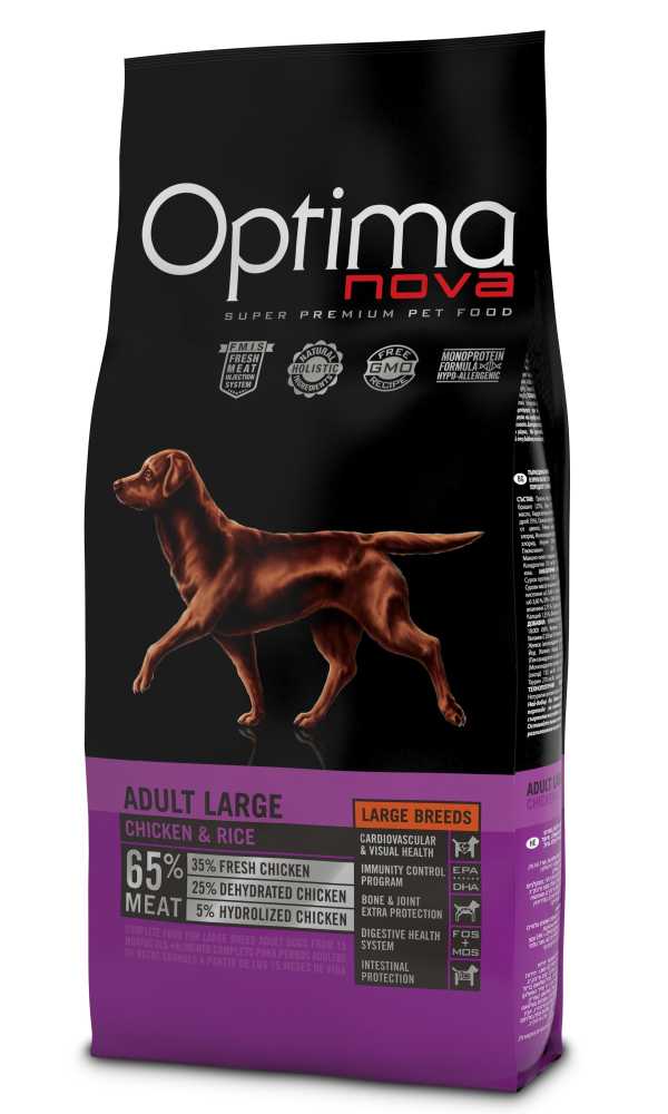 OPTIMAnova Dog Adult Large Chicken & Rice složené z kvalitních bílkovin a lehce stravitelných sacharidů v kombinaci s prospěšnými tuky . Krmivo obohacené o vitamíny, minerální látky a antioxidanty.