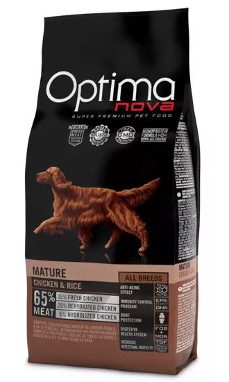 OPTIMAnova Dog Mature Chicken & Rice složené z kvalitních bílkovin a lehce stravitelných sacharidů v kombinaci s prospěšnými tuky . Krmivo obohacené o vitamíny, minerální látky a antioxidanty.