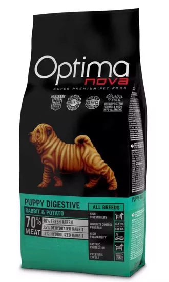 OPTIMAnova Dog Puppy Digestive Rabbit & Potato GF složené z kvalitních bílkovin a lehce stravitelných sacharidů v kombinaci s prospěšnými tuky . Krmivo obohacené o vitamíny, minerální látky a antioxidanty.